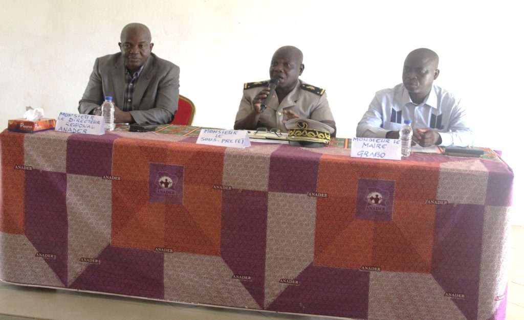 La cérémonie s’est tenue en présence de M. GUEU Ven Jean Noël, Sous-préfet de Grabo et président de la cérémonie, de M. KOUYA Koupet Louis, Premier Adjoint au Maire, représentant le Maire, ainsi que de M. SOULAMA Souleymane, Directeur Régional Sud-Ouest de l’ANADER. Plusieurs chefs de services, leaders communautaires, guides religieux, chefs de quartier et de nombreux habitants ont également pris part à la rencontre.