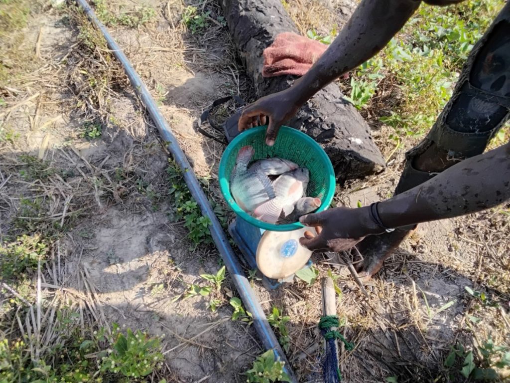 Lors de la visite précédente, les poissons présentaient un poids inférieur aux attentes, et des recommandations avaient été formulées à l’endroit du producteur. La présente séance de contrôle avait donc pour objectif d’apprécier les résultats des mesures correctives mises en œuvre. À l’issue de la pêche de contrôle, il a été constaté une légère augmentation du poids des poissons, traduisant une évolution positive de la croissance.